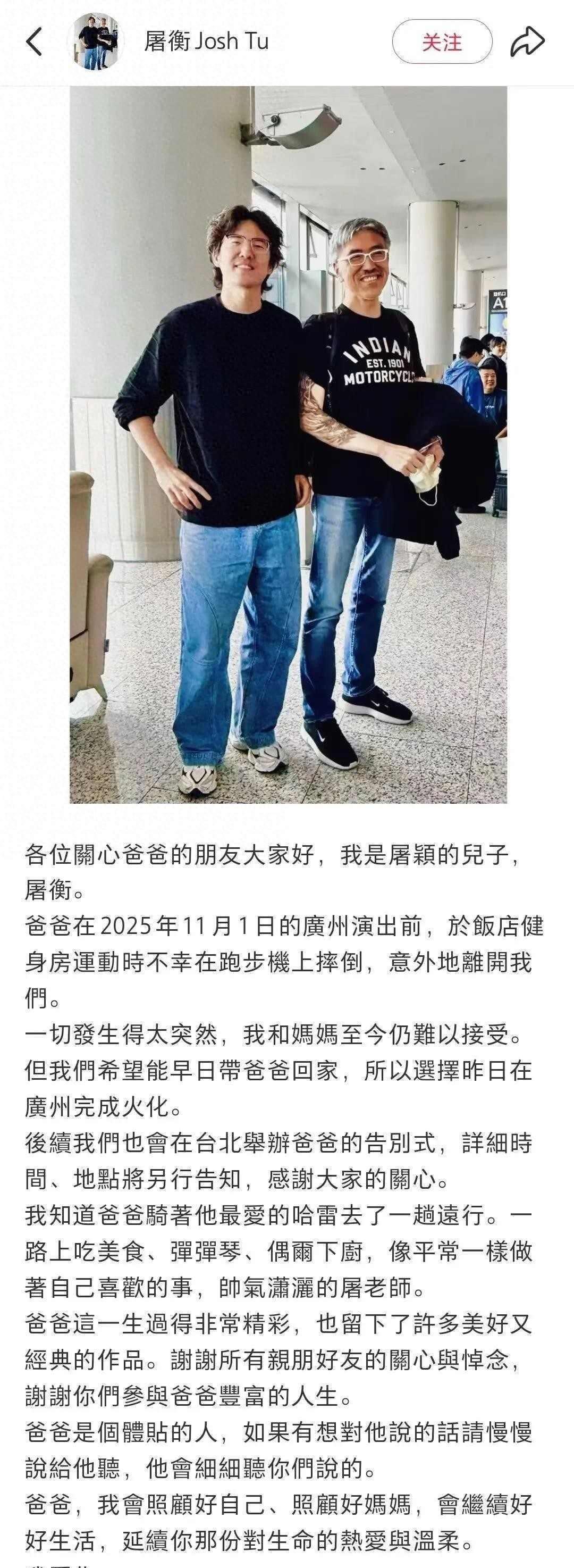 那天早上五点多,屠颖在微博上发了条动态,配图是广州的热干面和牛杂,他说这早餐比台北还要地道,他一直喜欢到处品尝美食,也经常运动,第二天一早,他照常去酒店健身房跑步,结果在跑步机上摔了一跤,头撞到地上,送医后没能救回来。